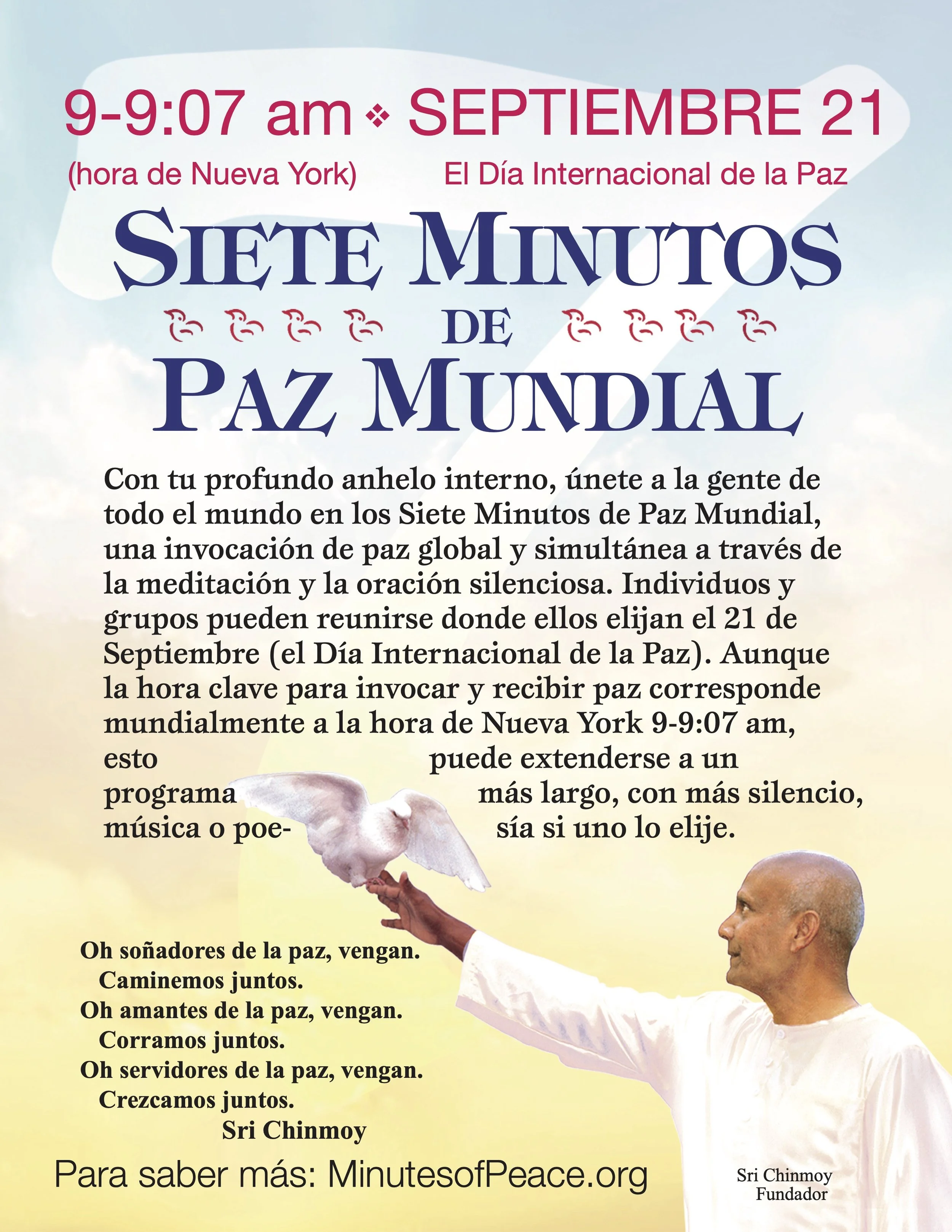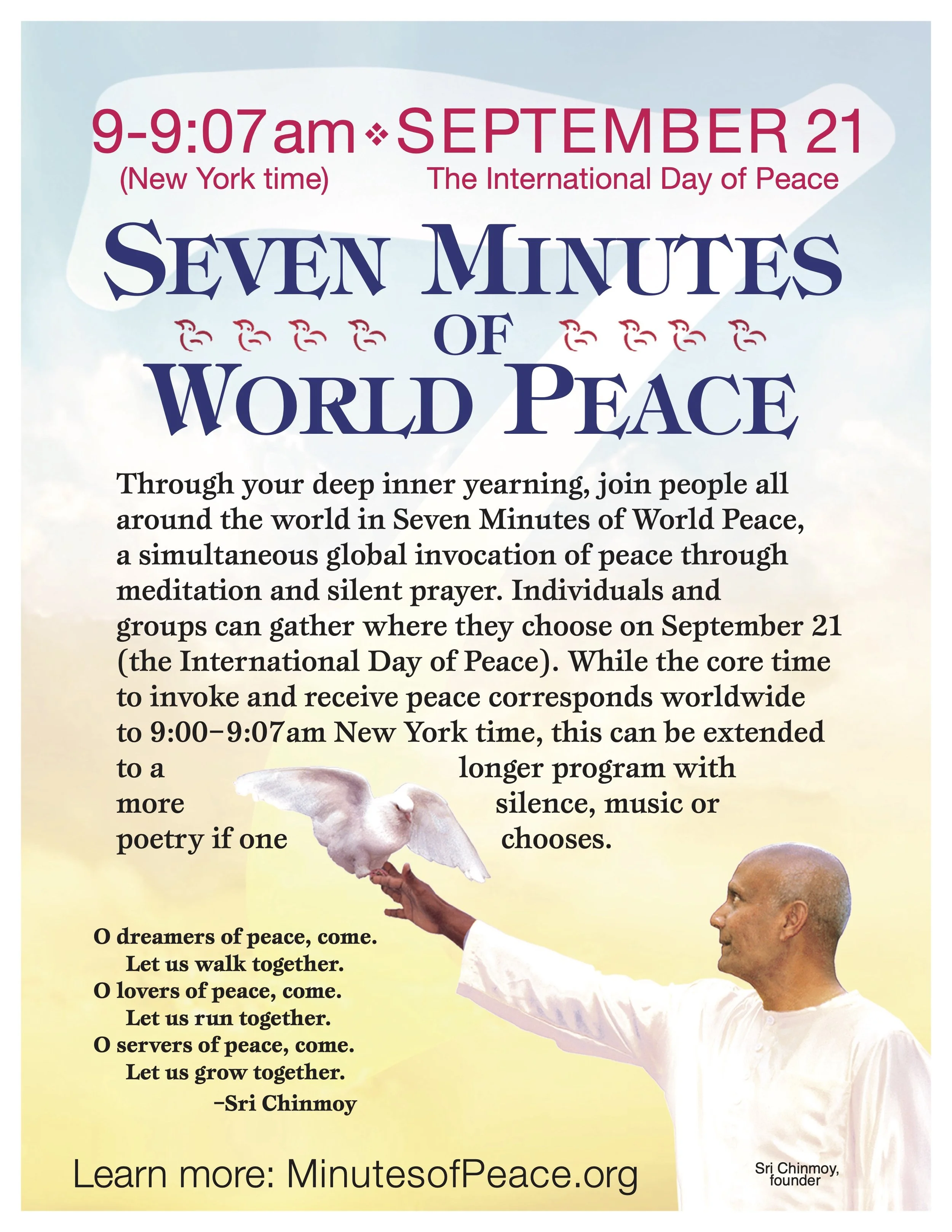 in Seven Minutes of World Peace, a simultaneous global invocation of peace on the International Day of Peace, September 21. From 9:00 – 9:07 a.m. New York time, invoke peace through silent prayer and meditation – your deep inner yearning. Participate individually or in a group. We are all gathering together.